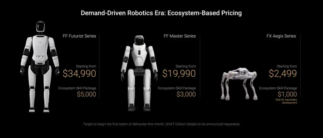 据介绍,FF Futurist系列起售价34990美元,生态系统技能包5000美元;FF Master系列起售价19990美元,生态系统技能包3000美元;FX Aegis系列起售价2499美元,生态系统技能包1000美元且仅用于二次开发,目标本月开始首批交付,GOAT版详情将另行公布。