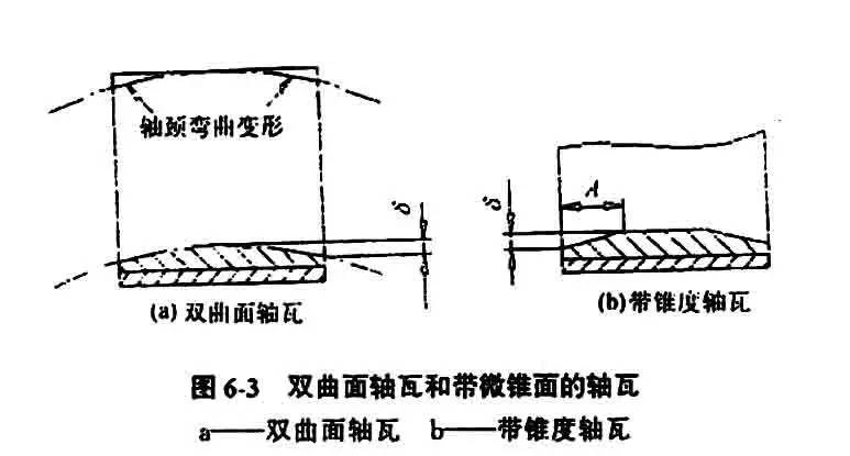 轴向变厚度轴瓦截面形状有两种。一种是双曲面轴瓦,一种是两端有微锥面轴瓦。双曲面轴瓦可在镗孔时形成,挠曲度δ≈0.0150.005,(见图6-3a)。当高强化的发动机受质量限制不能用加粗轴颈来保证高弯曲刚度时,用双曲面轴瓦比较适应。两端带有微锥面的抽瓦(见图6-3b)有类似作用。
