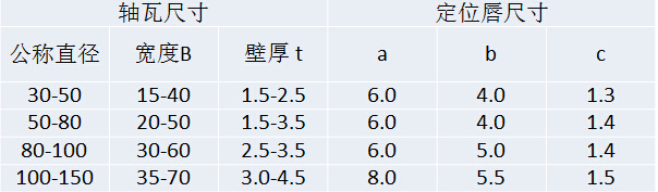 定位唇尺寸的推荐值见表6-7。定位唇不应设在轴瓦中部,使上下瓦有所区别。定位唇边距油槽边缘、轴瓦前后边缘和翻边内侧的距离不得小于2mm。在普通轴瓦中,也可设于瓦宽的一侧,使一个唇边与瓦边重合。