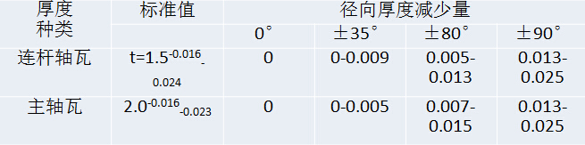 由于轴瓦以很大过盈量装配于座孔中.瓦口附近将产生内缩的趋势,如图6-1。它导致对口平面附近合金层发生早期磨损和咬合现象。为此,应在从对口平面算起10一25范围内将壁厚予以削薄。削薄应当适当,过大的削薄量对油膜的连续性有影响。削薄范围及削薄量见表6-5。现有机型轴瓦削薄范围及削薄量见表6-6