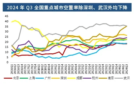 消费客流的逐渐恢复带动商业租赁的活跃度提升,扭转疫情期间零售商业地产空置率持续上涨的格局。2024年三季度末全国重点21城优质零售地产市场平均空置率报10.1%,连续第六个季度环比下行。其中一线年以来低值,但非一线城市空置率回落缓慢或与年初持平。