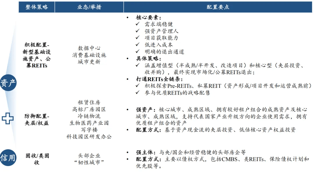 以“积极配置新型基础设施资产及公募REITs、夹层/权益策略防御性配置强资产、持续配置固收/类固收项目”为核心策略。