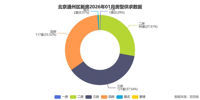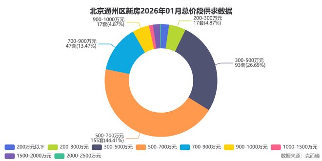 克而瑞数据显示,2026年1月通州新房市场总价段分布呈现明显的改善型特征,500-700万元区间成交155套,占比高达44.4%,成为绝对主力。300-500万元区间成交93套,占比26.6%,两者合计超过七成,反映出通州市场已从刚需主导转向刚改并重。