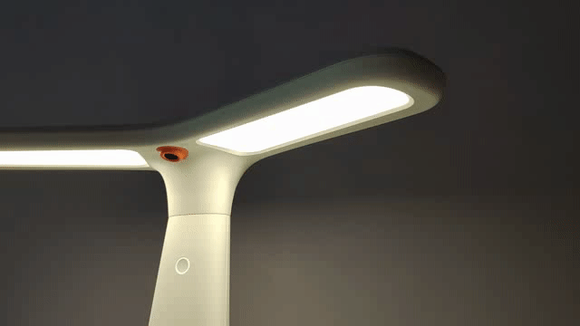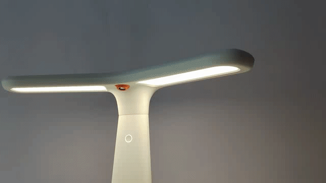 大力智能作业灯 T5 Pro 的顶端上方是是独特双翼灯头,双翼灯头造型类似 V 字回旋镖,两侧向内延伸,这种设计的好处是增大桌面上的照明面积,减少阴影,更好地护眼。