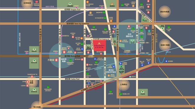 交通配套方面:项目地处长宁、徐汇、闵行三区交汇的金虹桥板块的核心区位,拥有多维立体的交通,延安高架、中环线、外环线环伺。