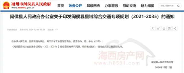 2024年12月16日,《闽侯县县域综合交通专项规划(2021-2035)》正式印发执行。