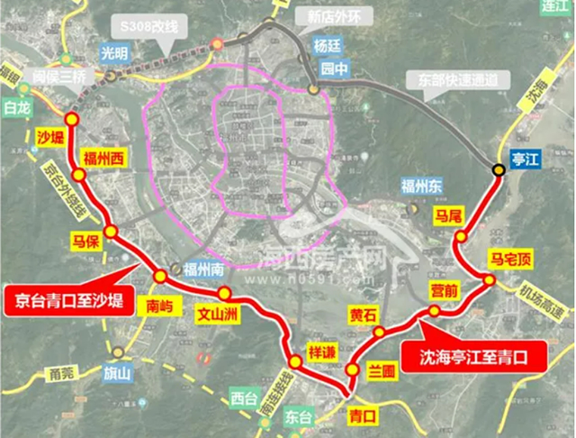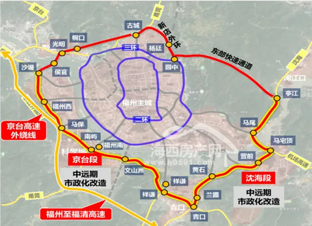 串联福州主城核心区、大学城、汽车城、长乐、马尾、荆溪等区域,形成周边组团的快速串联互通,并通过放射线与滨海新城、国际航空城、丝路海港城、连江物流城形成紧密联系。