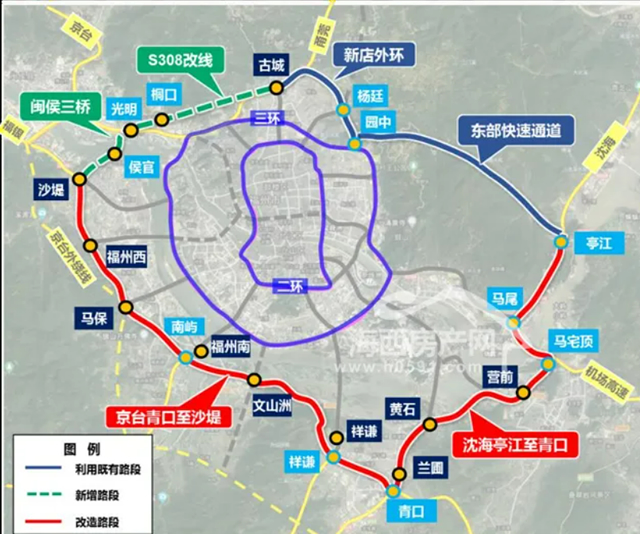 规划线位走向为:东部快速路-新店外环路-绕城高速-绕城高速三环外绕线-闽侯三桥-京台高速(福银高速)-沈海高速。