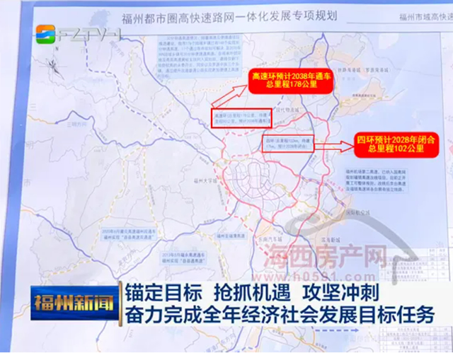 在这则报道画面中,福州都市圈高快速路网一体化发展专项规划布局图显示,福州“四环”预计2028年闭合,总里程102公里,待建17公里;“高速环”预计2038年通车,总里程178公里,待建80公里。