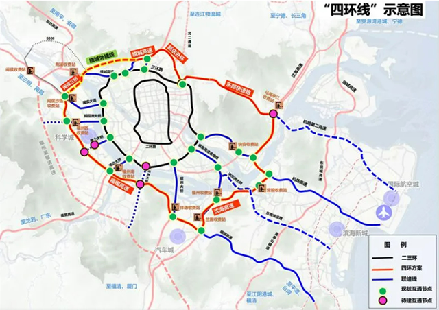 连续、快速的城区“四环路”,能在串联中心城区的同时,与滨海新城建立轴向联系,让连江、琅岐、长乐、闽侯等地“环环相扣”,实现中心城区与三江口、滨海新城、大学城、东南汽车城、国际航空城等区域的快速互联互通。